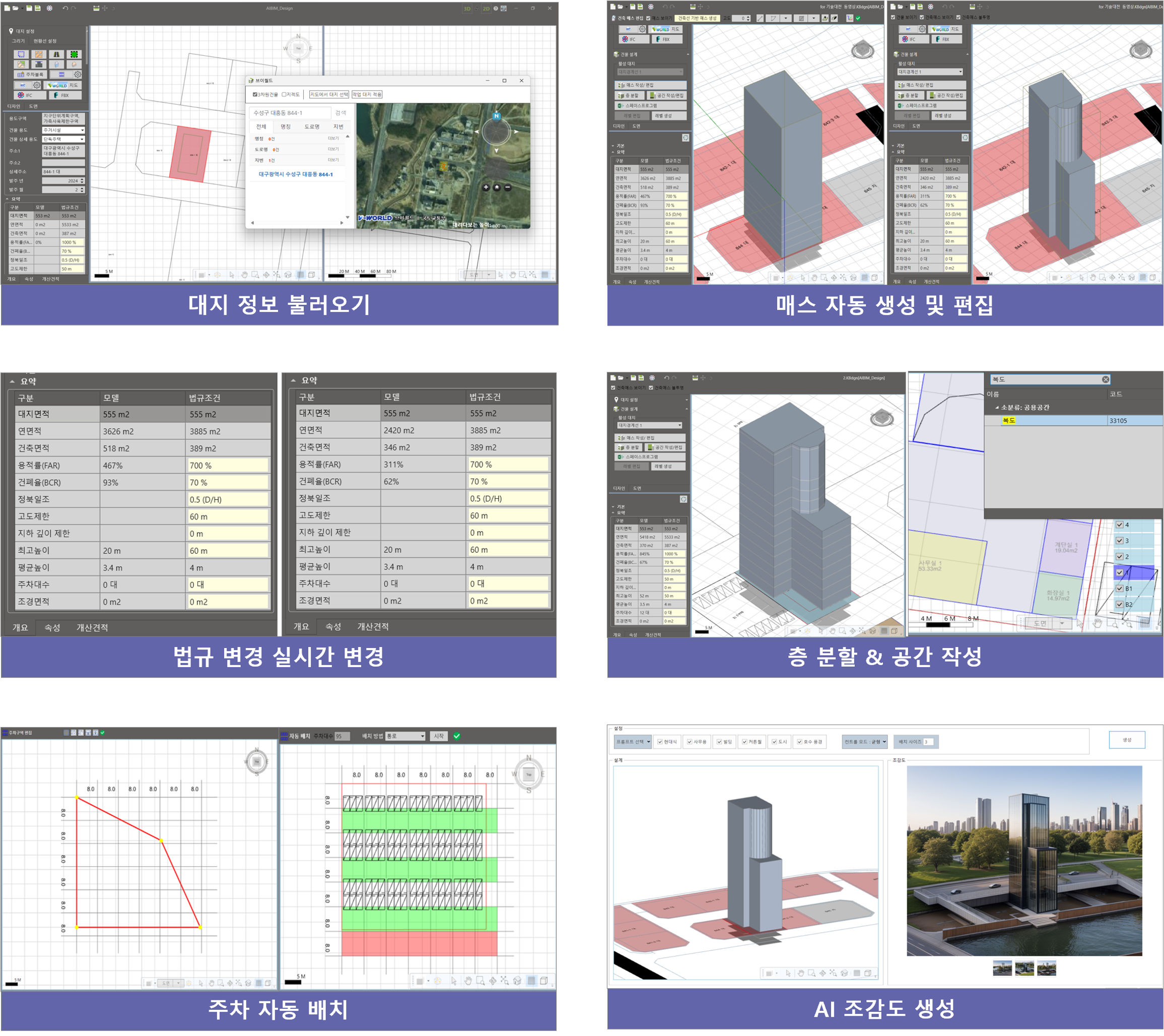 또한, 층 분할, 공간 작성, 견적 계산 등의 기능을 제공하며 대지에 적용되는 다양한 법규조건을 고려하여