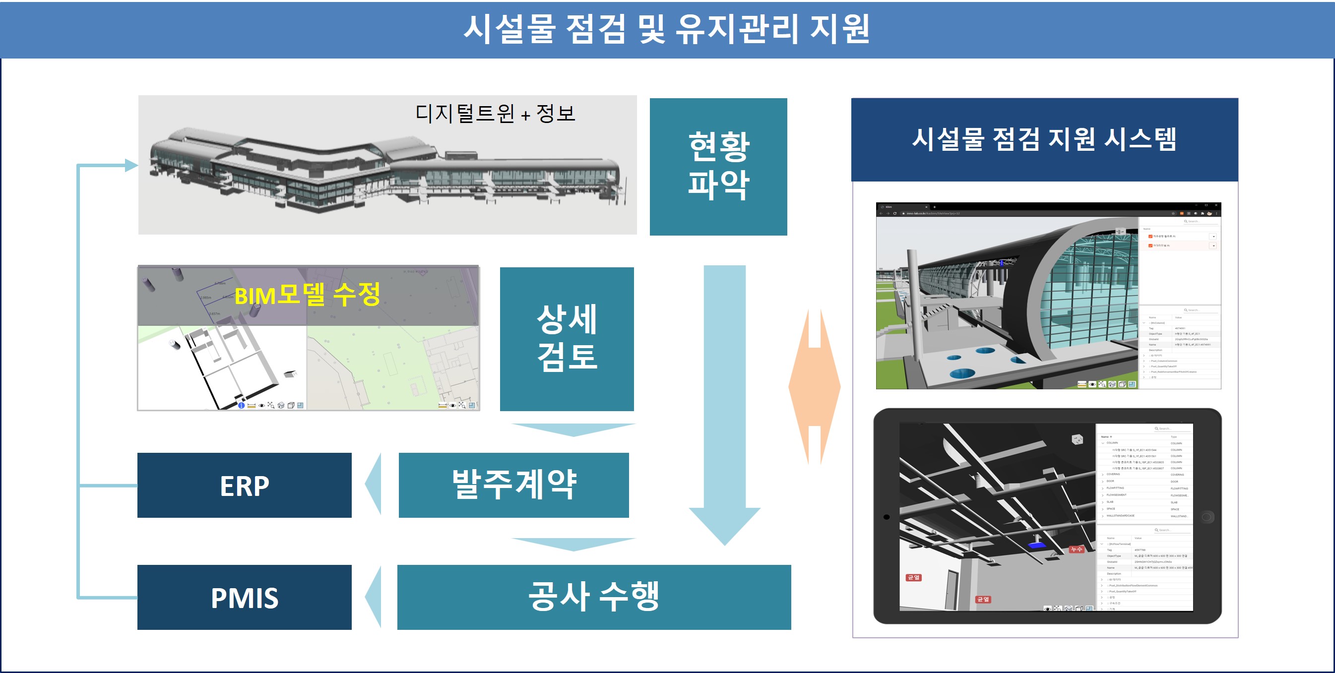 시설물의 디지털트윈과 포함된 정보를 기반으로 시설물의 점검과 유지관리에 필요한 작업을 지원합니다. 모바일 기반의 뷰어를 제공하여 점검 및 유지관리 정보의 현장 취득과 활용을 가능하게 합니다.
