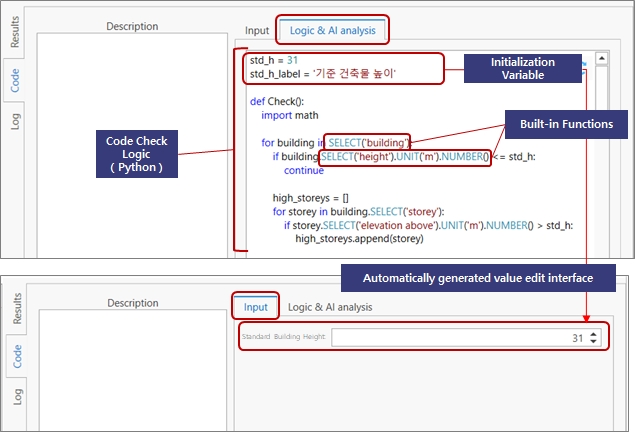 BIM 모델에서 정보를 추출하는 내부함수(Built-in Functions)로 구성됩니다. 품질검토를 하는 논리구조는 파이썬 스크립트로 작성될 수 있도록 하여